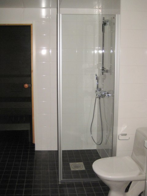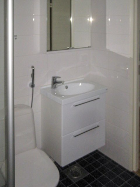 - WC-istuin, suihku, suihkuseinä, pesukoneliitäntä, lattialämmitys, peilikaappi, pesuallas, ja allaskaappi
