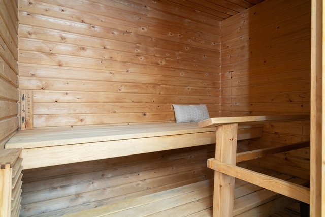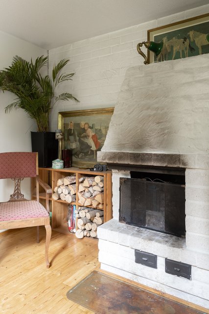 Alakerrassa on saunaosasto, kodinhoitohuone ja makuuhuone, takkahuone ja myös erillinen wc. Takka on varaava .