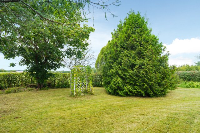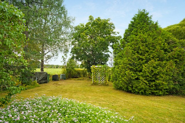 - Iso nurmikkopiha, joka rajautuu pellonreunaan.