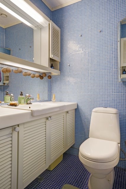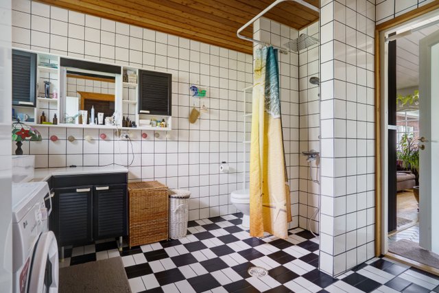 - WC-istuin, suihku, suihkuseinä, lattialämmitys, pesukoneliitäntä, pesuallas, ja allaskaappi