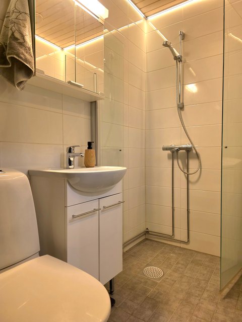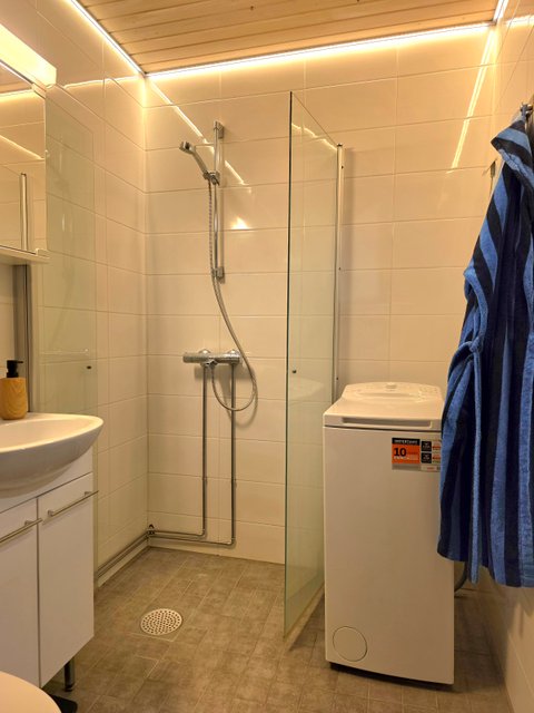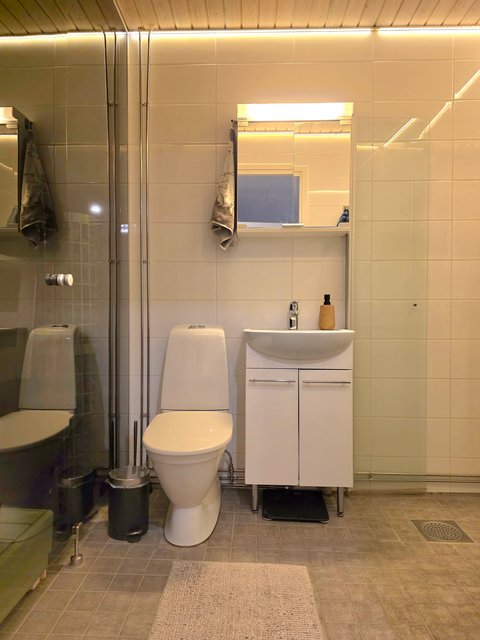 - WC-istuin, suihku, suihkuseinä, pesukoneliitäntä, lattialämmitys, peilikaappi, peili, pesuallas, allaskaappi, ja bidee-suihku