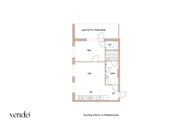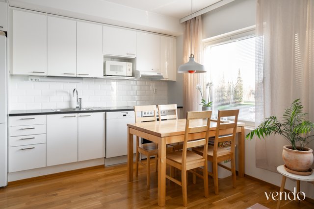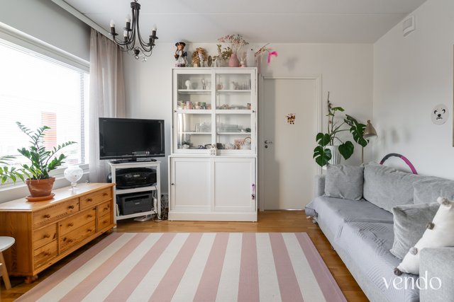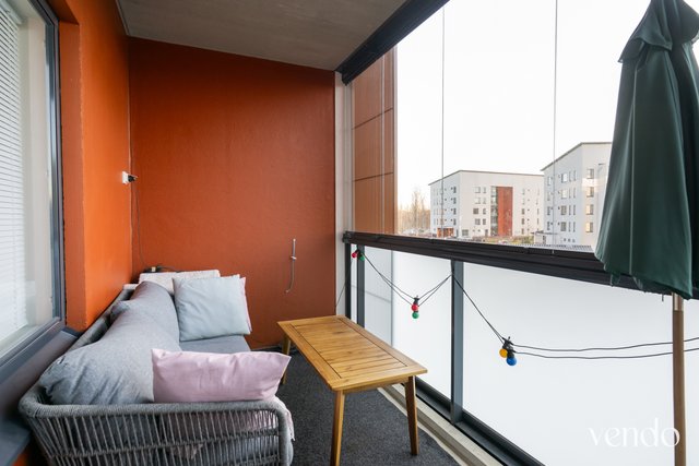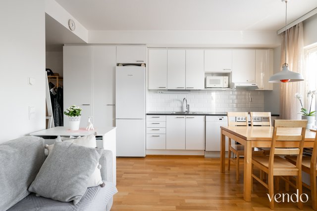 Asunnon selkeä pohjaratkaisu tarjoaa viihtyisät puitteet arkeen: tilava olohuone, hyvin varusteltu keittiö sekä makuuhuone, jossa runsaasti säilytystilaa vaatehuoneessa. Oman lisämukavuutensa tuo oma sauna ja suuri lasitettu parveke.