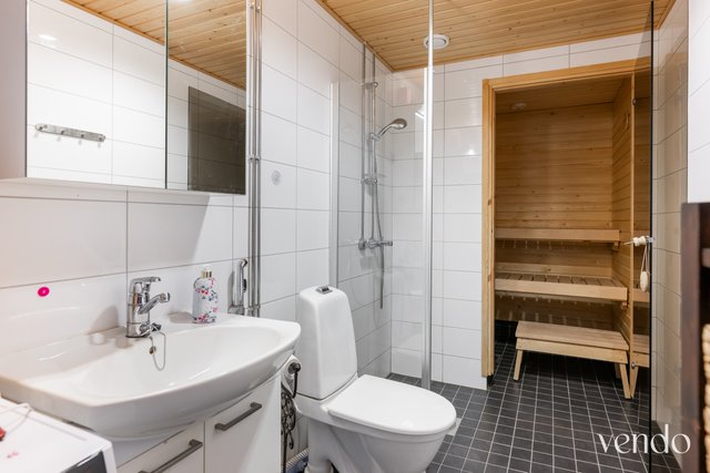 - WC-istuin, suihku, suihkuseinä, pesukoneliitäntä, peilikaappi, pesuallas, allaskaappi, ja bidee-suihku