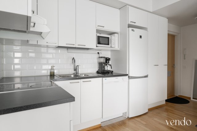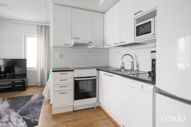 - Jääkaappipakastin, liesi, liesituuletin, astianpesukone, ja keittiösaareke