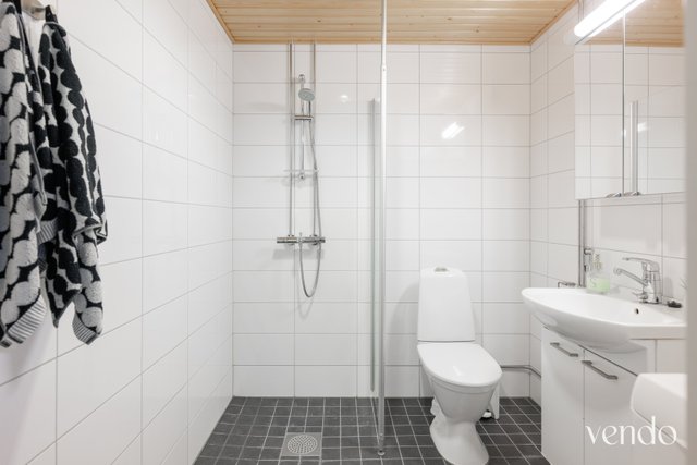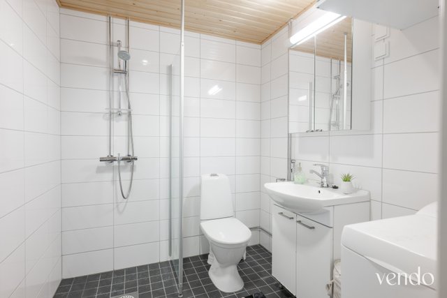 - WC-istuin, suihku, lattialämmitys, bidee-suihku, allaskaappi, pesuallas, pesukoneliitäntä, peilikaappi, ja suihkuseinä