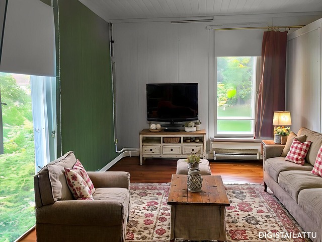 - Hyvänkokoinen olohuone, jonne mahtuu hyvin myös sänky.