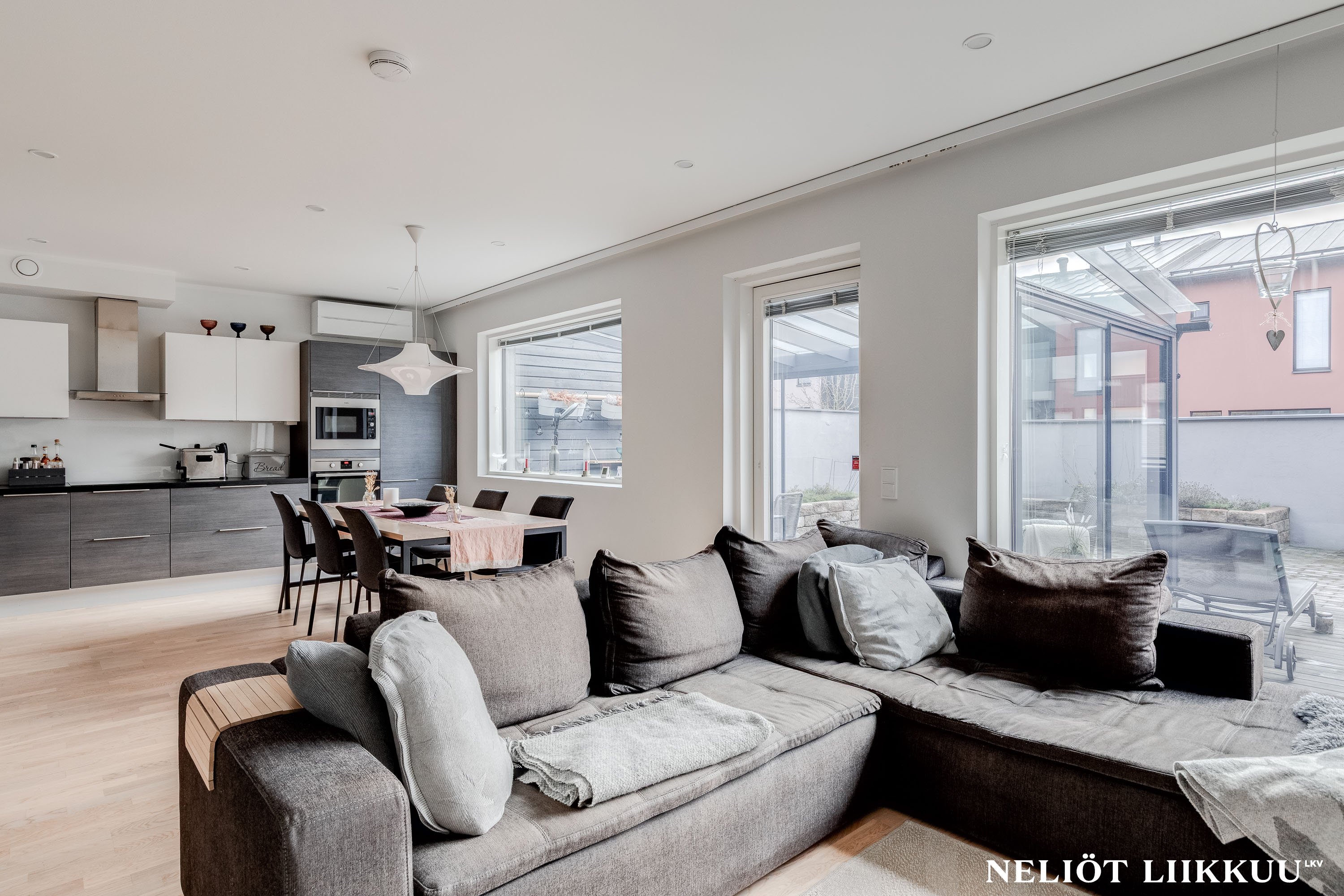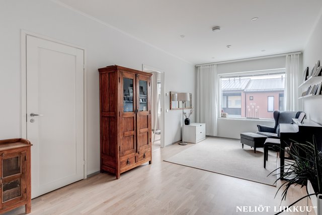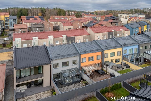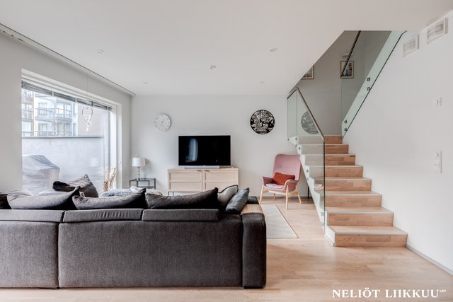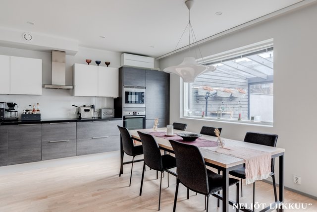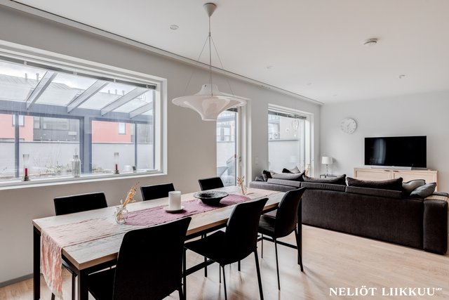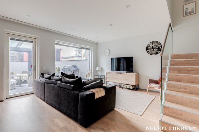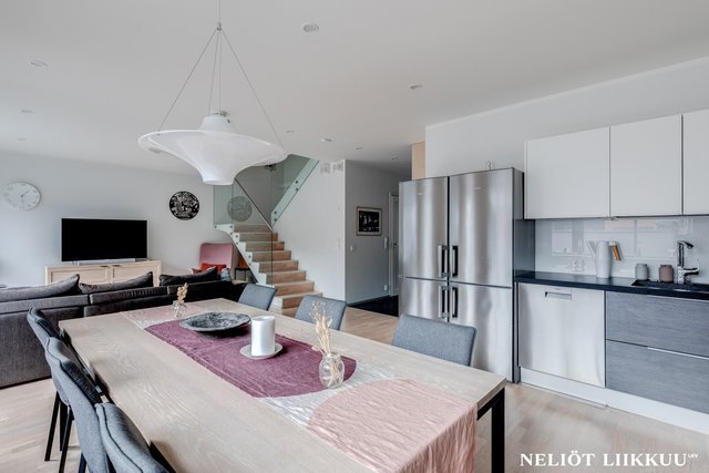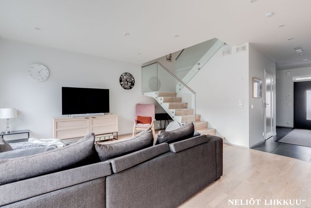 - Avara ja valoisa olohuone yhdistyy tyylikkäästi avokeittiöön ja ruokailutilaan, luoden täydellisen kokonaisuuden yhdessäoloon ja viihtymiseen. Olohuoneesta on käynti aidatulle takapihalle, jossa lasitettu terassi tarjoaa mukavan lisätilan oleskeluun ympäri vuoden. Tyylikkäät portaat johdattavat yläkertaan ja viimeistelevät tilan harmonisen ilmeen.