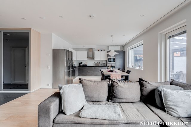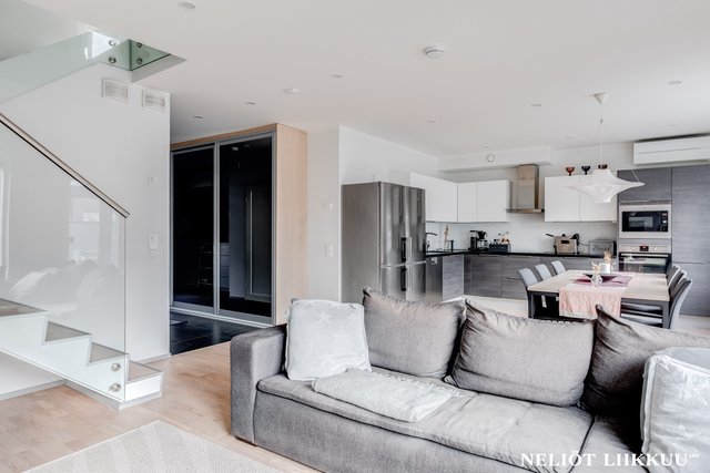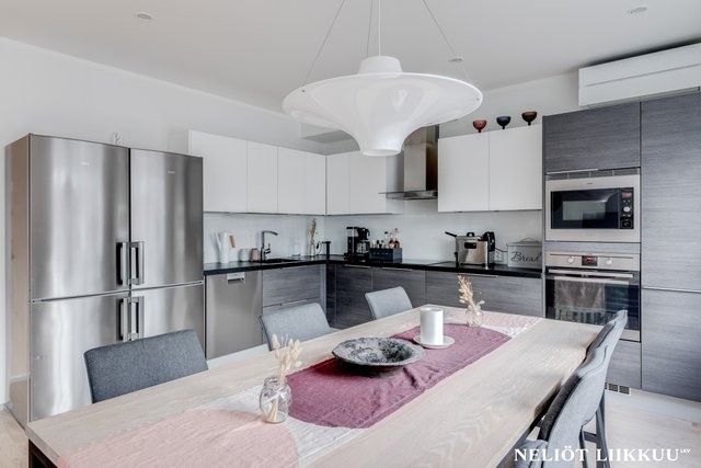 - Tyylikäs ja toimiva avokeittiö yhdistyy saumattomasti olohuoneeseen, luoden avaran ja kutsuvan tilan niin arkeen kuin juhlaan. Keittiöstä löytyy kaikki kotikokin toivoma: täyskorkeat jääkaappi ja pakastin, integroidut erillisuuni ja mikroaaltouuni sekä laadukkaat kodinkoneet. Upeat, kestävät kivitasot tarjoavat reilusti työskentelytilaa ja on helppo pitää aina siistin näköisinä.