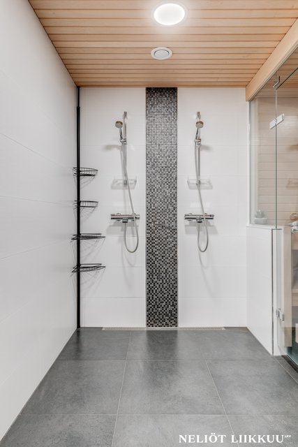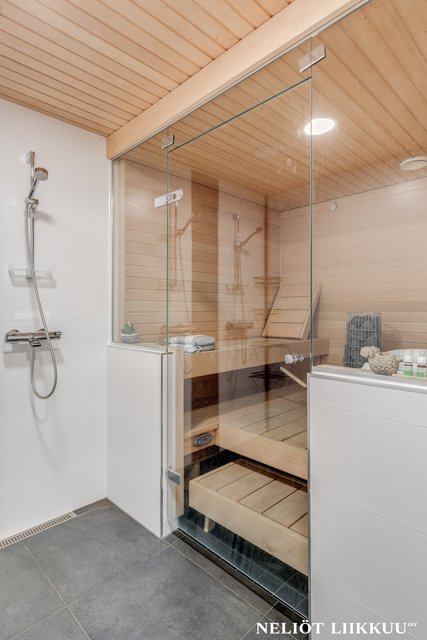- Todella tilava ja tyylikäs kylpyhuone, jossa arjen mukavuudet ovat kohdallaan – kaksi suihkua tuovat käytännöllisyyttä ja ylellisyyttä arkeen. Lasiseinän takana odottaa upea sauna, jossa on helppo rentoutua ja nauttia omasta rauhasta.