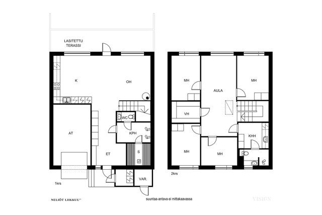 - Kokonaisala on asiakirjojen mukaan 191m2 (RAHU), kerrosala 160m2, huomeistoala 155m2 (RAHU) , lämmin autotalli n.20 m2, tekninen tila 2,5m2 ja varasto 2,5m2, lasitettu terassi n.15m2. Asunnossa tämän lisäksi viimeistelemätön 32m2 käyttöullakko. Ei tarkistusmitattu. Pinta-ala voi siis olla edellä mainittua pienempi tai suurempi.
