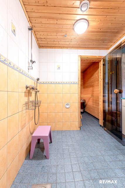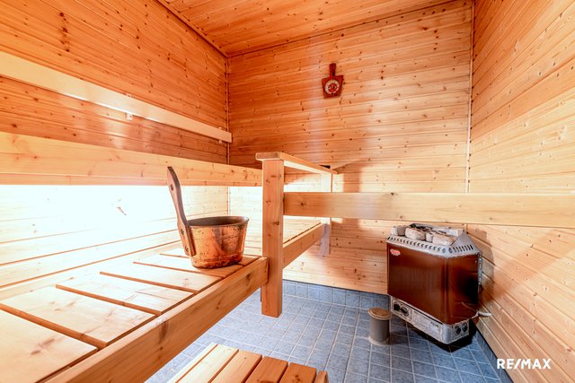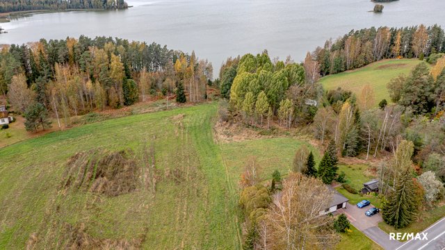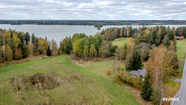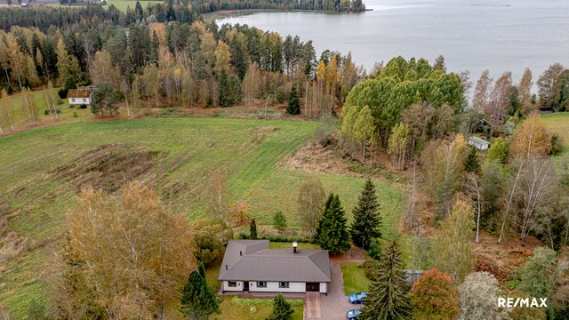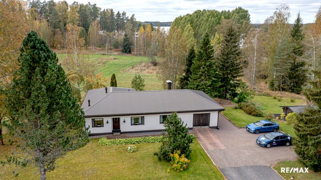 Talon yhteydessä on autotalli ja talon takana on tilava terassi järvinäköalalla.