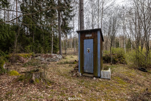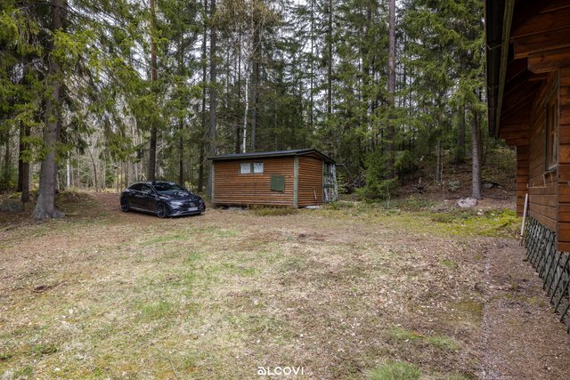 Pihapiiriin sijoittuu mökin lisäksi tilava varastorakennus, sekä ulkohuussi, joka löytyy pihan perältä.