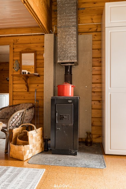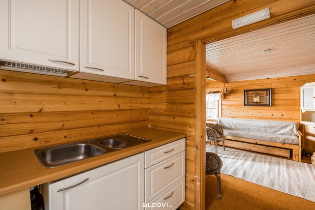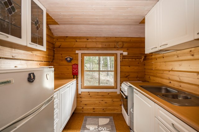 - Keittiö on 2000-luvulta. Varustukseen kuuluu kaasulla toimiva jääkaappi-pakastin ja liesi sekä tiskialtaat. Ei juoksevaa vettä. Työtasot on laminaattia, seinät hirttä.