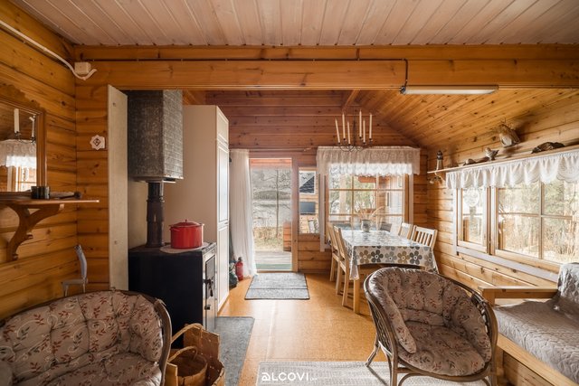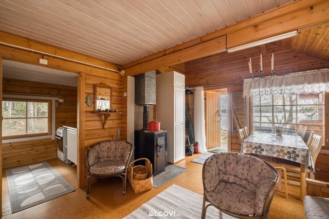 Vuonna 1985 valmistunut mökki kätkee sisäänsä tilavan olohuoneen, keittiön ja makuuparven, sekä katetun terassin merinäkymin. Kokkailu hoituu vaivatta kaasukäyttöisellä liedellä. Aurinkopaneeli tuottaa akkuihin virtaa sähkölaitteiden varalle. Upon kamiina lämmittää mökin tarvittaessa hyvin tehokkaasti. Mökin yhteyteen sijoittuvassa saunassa nautit aidon puukiukaan pehmeistä löylyistä!