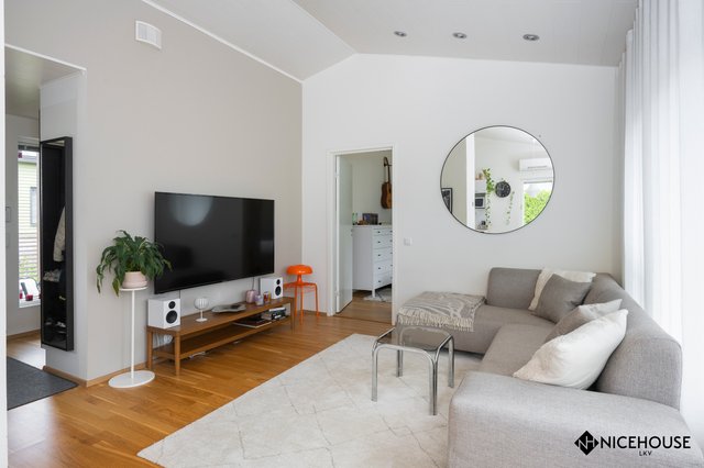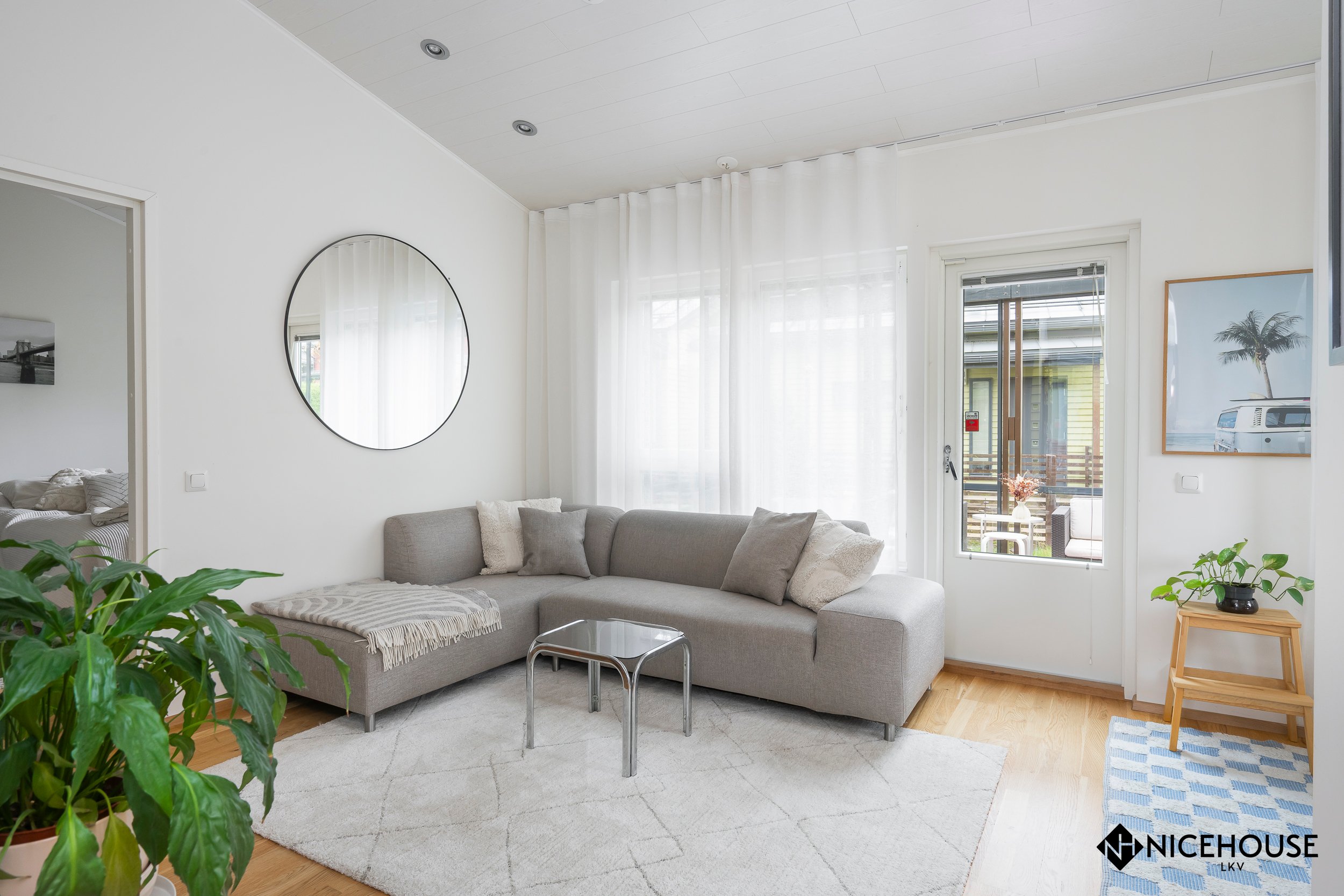 - Valoisa olohuone, johon korkea huonekorkeus tuo lisää avaruutta