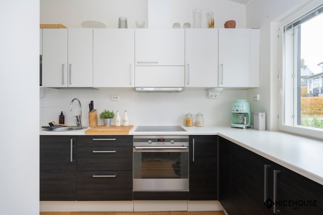 - Tyylikäs keittiö, jossa tummasävyiset alakaapit ja vaaleat yläkaapit