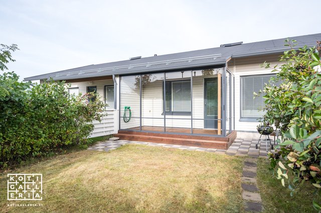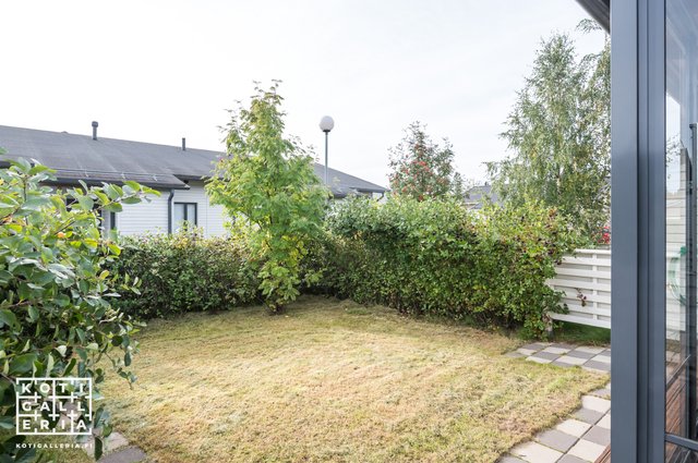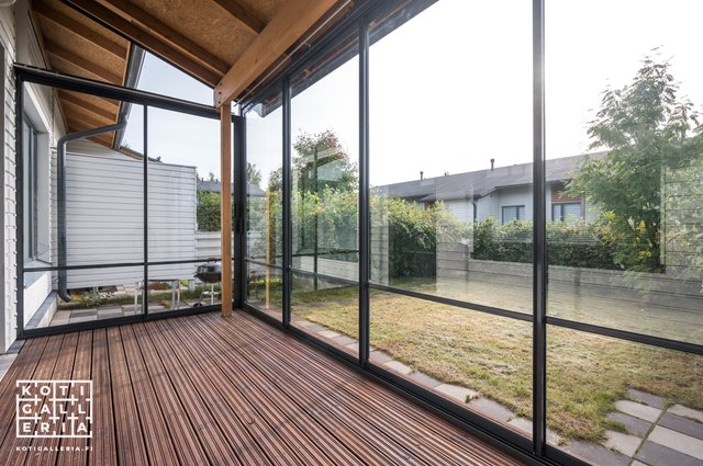 Lasituksen ansiosta terassilla oleskelusta voi nauttia pitkälle syksyyn ja pensasaidalla rajatulla pihalla on hyvin tilaa istutuksille.