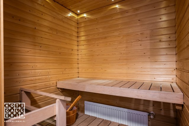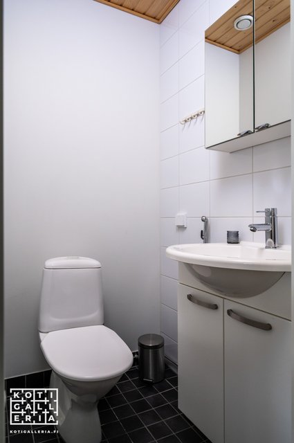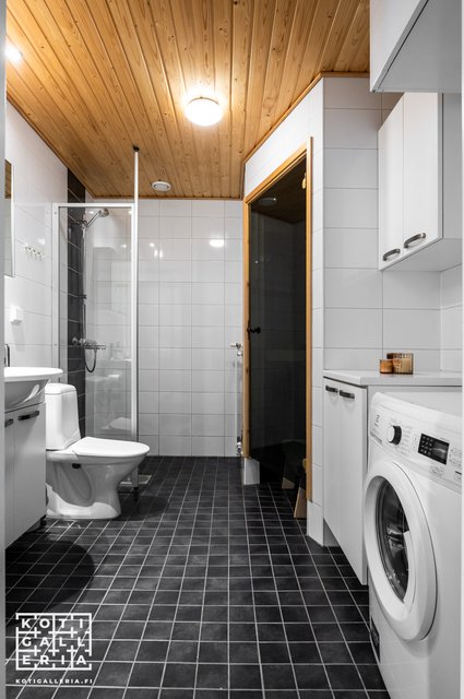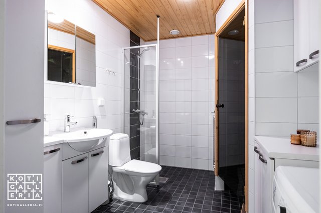 - WC-istuin, suihkuseinä, pesukoneliitäntä, lattialämmitys, pesuallas, allaskaappi, ja bidee-suihku