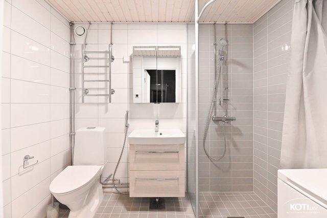 - WC-istuin, suihkuseinä, suihku, pesukoneliitäntä, lattialämmitys, peilikaappi, pesuallas, allaskaappi, bidee-suihku, ja rättipatteri