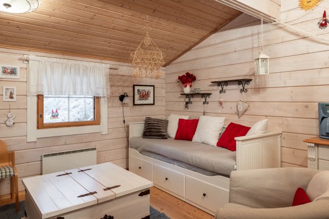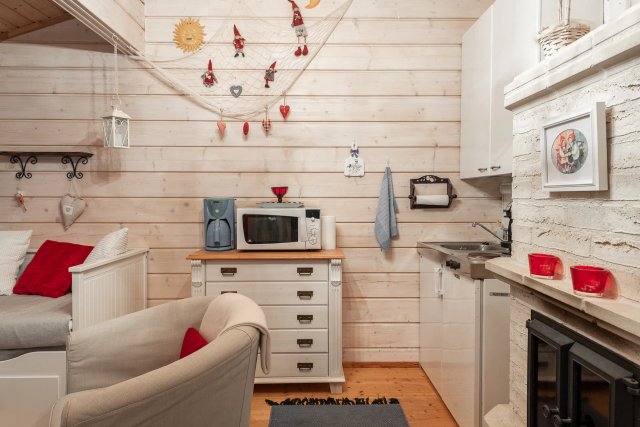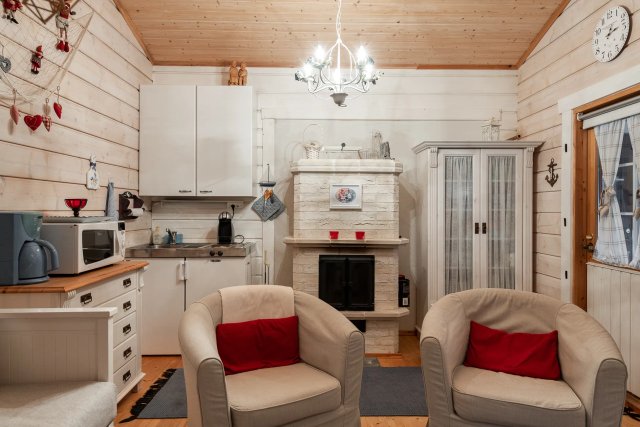 Rantamökissä voit nauttia puulämmitteisen saunan lämmössä ja viettää iltaa takkatulen äärellä.