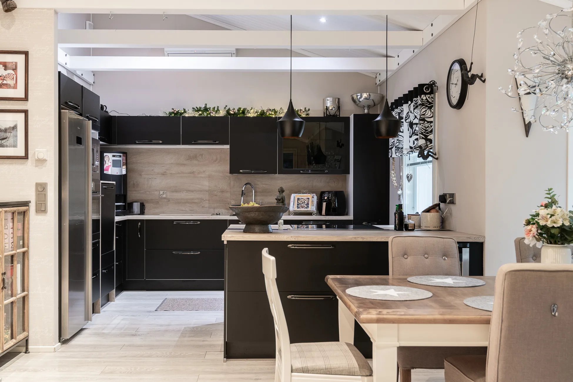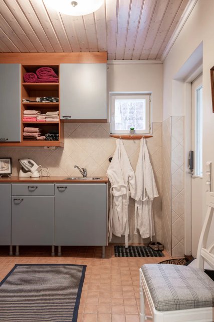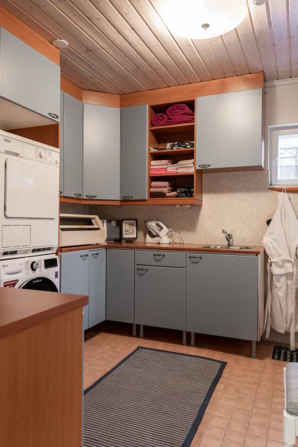 - Avokeittiö, jääkaappi, induktioliesi, integroitu liesituuletin, astianpesukone, kiertoilmauuni.