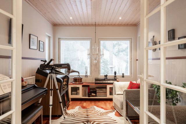 Olohuoneen yhteydessä olevalta lasitetulta parvekkeelta avautuvat upeat näkymät Riihivuoden laskettelurinteeseen.