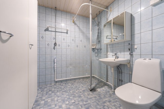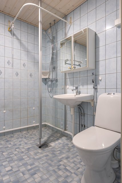 - WC-istuin, suihku, pesukoneliitäntä, pesuallas, peilikaappi, suihkuseinä, kaapit, ja bidee-suihku