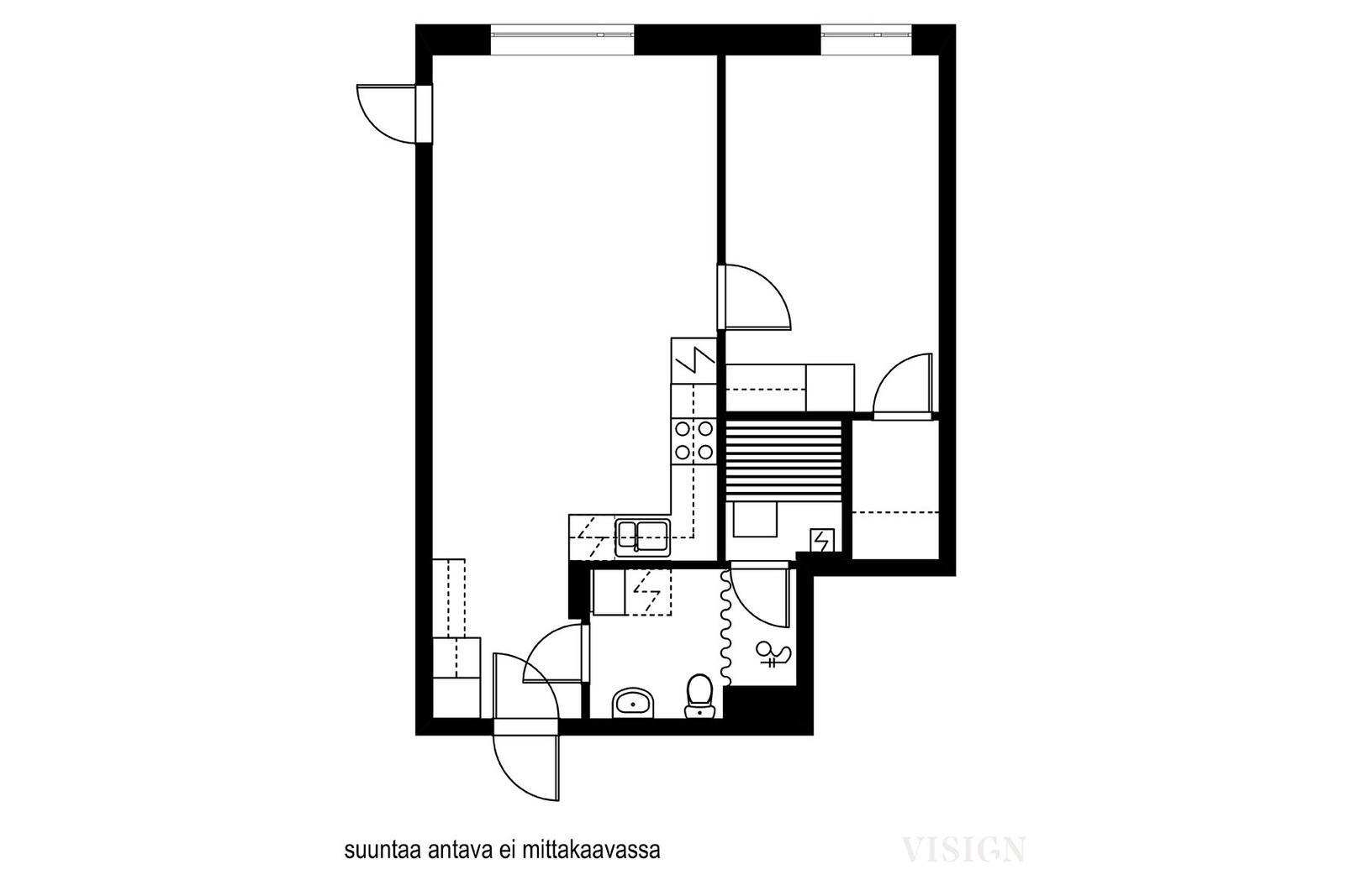 - Allaskaappi, wc-istuin, peili, suihku, lattialämmitys, pesukoneliitäntä, ja kiinteät valaisimet