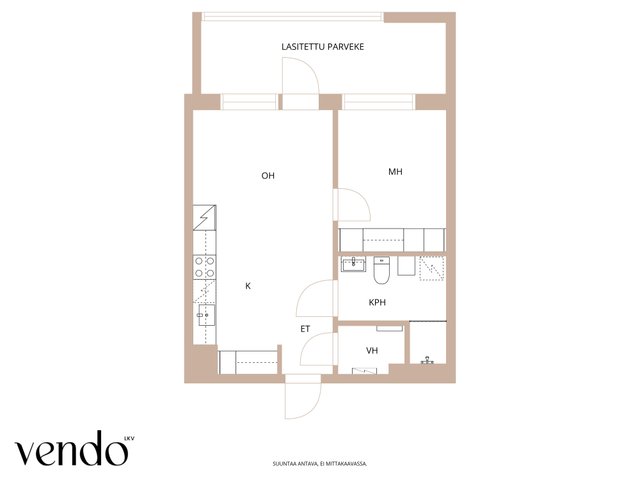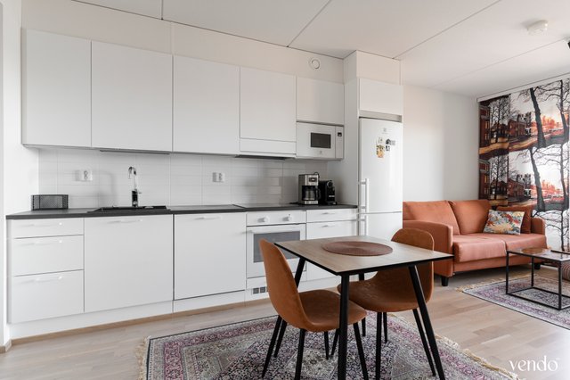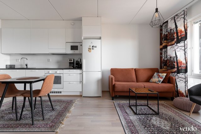 Pohjaratkaisu on tehokas ja toimiva: avara olohuone yhdistyy tyylikkääseen avokeittiöön, makuuhuoneessa on hyvin säilytystilaa, ja kylpyhuone on moderni ja tilava. Laadukkaat materiaalit tekevät tästä kodista helposti lähestyttävän ja viihtyisän.