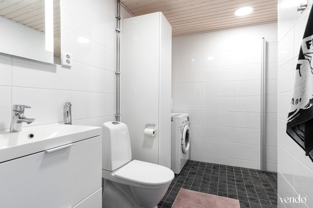 - WC-istuin, suihku, suihkuseinä, pesukoneliitäntä, peili, allaskaappi, pesuallas, ja bidee-suihku