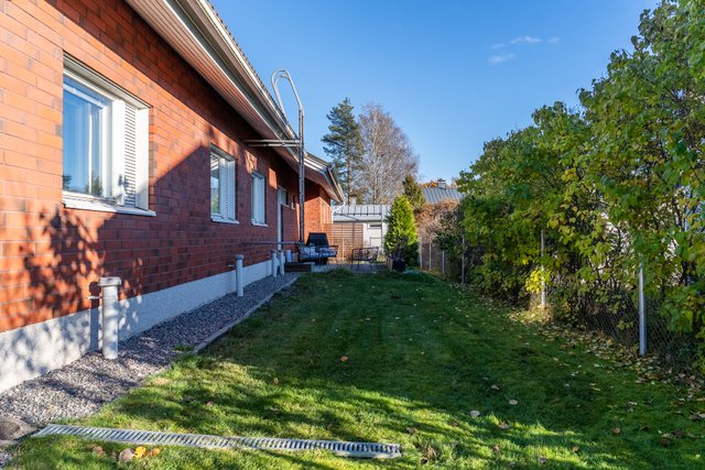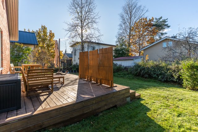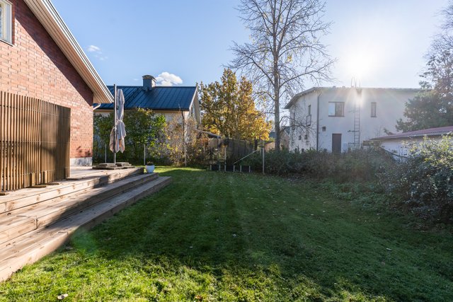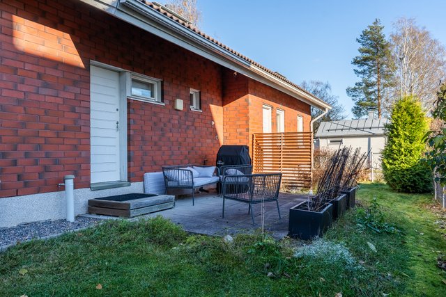 Talon suojaisa puutarhapiha avautuu etelään ja länteen, mikä mahdollistaa auringosta nauttimisen omalla terassilla koko päivän. Piha tarjoaa hyvin tilaa lasten leikeille ja puutarhanhoidolle sekä grillihetkille perheen ja ystävien kanssa.