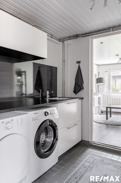 - Lattialämmitys, pöytätaso, pesukone, kuivausrumpu, ja lattiakaivo