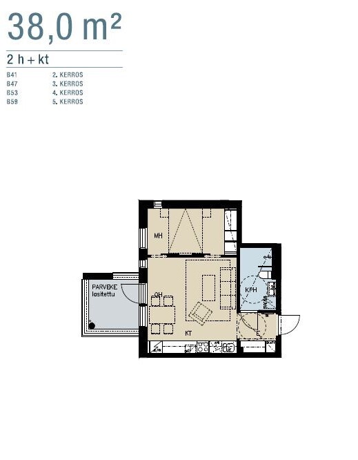 Keittiössä on runsaasti lasku- ja säilytystilaa, ja olohuoneesta on kulku lasitetulle parvekkeelle, joka tuo lisää tilaa arkeen ja tarjoaa viihtyisän oleskelupaikan ympäri vuoden.