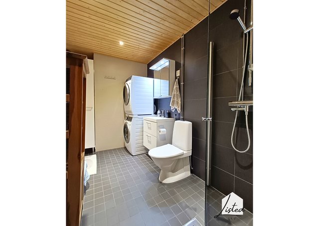 - WC-istuin, suihku, suihkuseinä, pesukoneliitäntä, lattialämmitys, bidee-suihku, peilikaappi, allaskaappi, ja pesuallas
