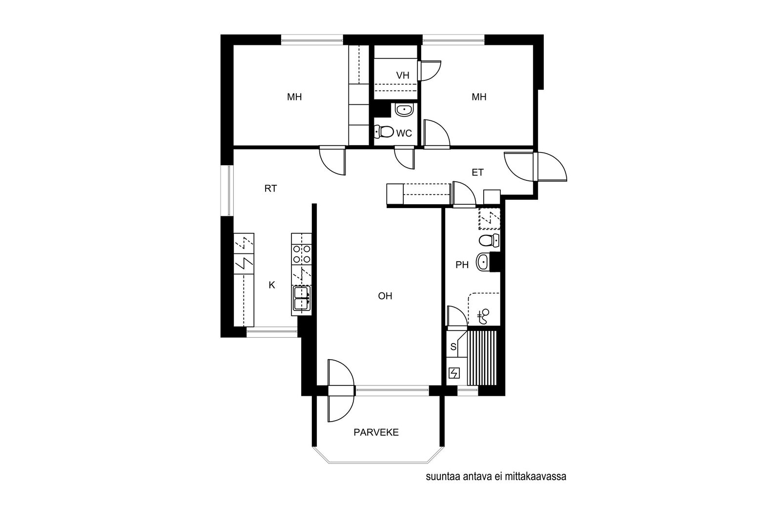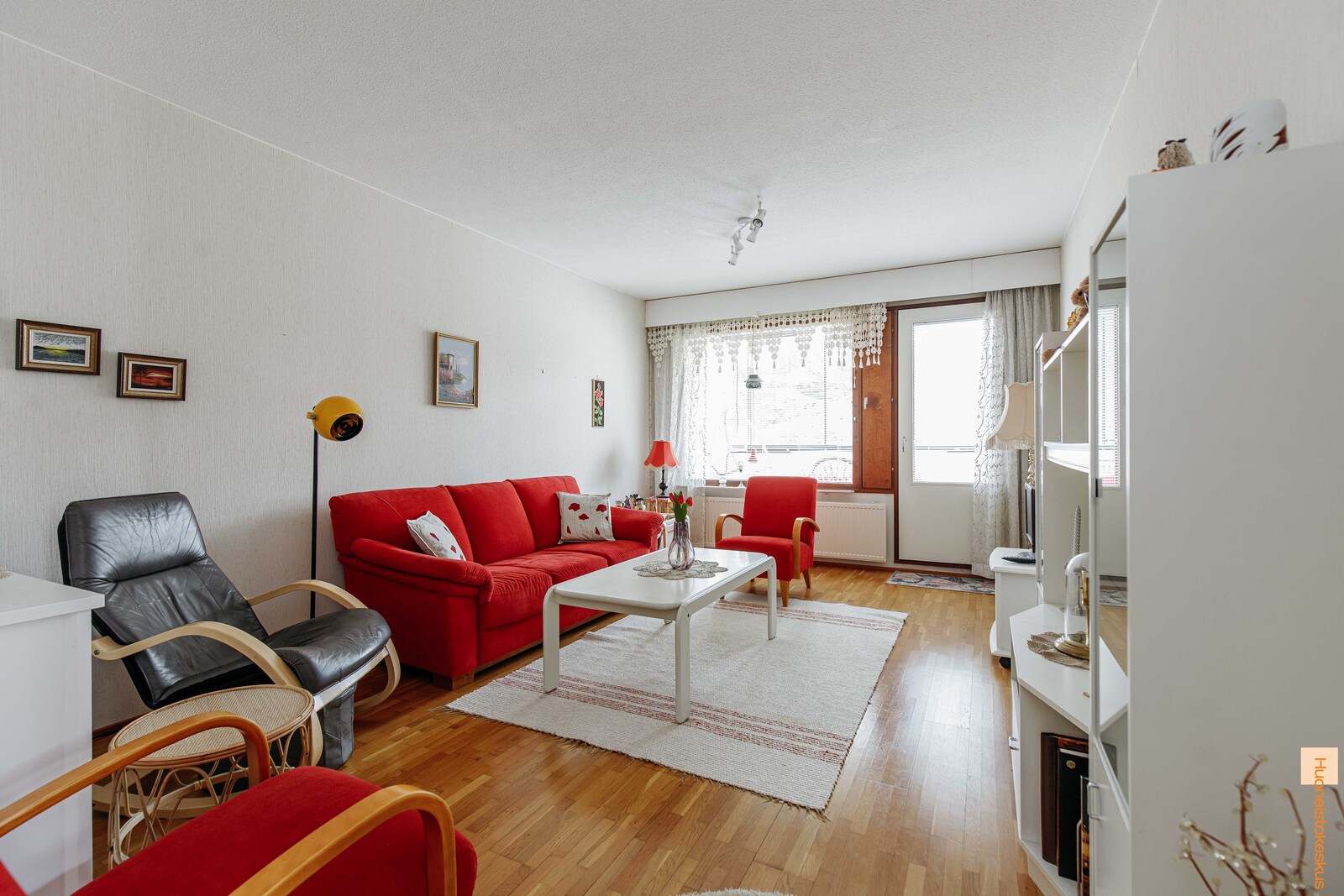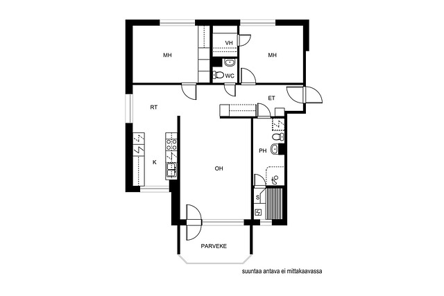 Asunto on pääosin alkuperäisessä, mutta siistissä kunnossa. Valoisa päätyhuoneisto, jossa kolmioksi reilu määrä neliöitä. Erillisessä keittiössä hyvin sekä kaappi- että laskutilaa. Tilava pesuhuone, jonka yhteydessä sauna. Erillinen wc ja vaatehuone asumismukavuutta lisäämään. Lasitettu länsisuuntainen parveke, jonne kulku olohuoneesta.