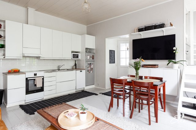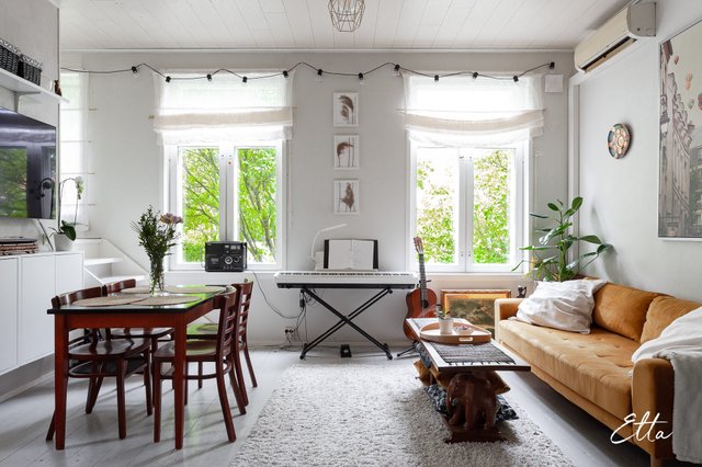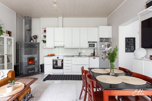 Asunnon alakerrassa yhdistyvät avokeittiö, ruokailutila ja olohuone saumattomasti toisiinsa, muodostaen yhtenäisen ja valoisan kokonaisuuden. Yläkerta tarjoaa tilavan makuuhuoneen, jossa on hyvä seisomakorkeus ja mahdollisuus luoda esimerkiksi viihtyisä etätyöpiste. Arkea helpottaa erillinen vaatehuone. Kauniisti remontoitu koti yhdistää tyylikkäästi alkuperäisen puutalotunnelman ja modernin toiminnallisuuden. Ulkokautta pääsee lisäksi kellarikerrokseen, jossa on runsaasti varastotilaa. Taloyhtiön hyvin hoidettu, vehreä pihapiiri kutsuu viihtymään ja pihan perältä löytyvä yhteinen pihasauna viimeistelee ihastuttavan kokonaisuuden.