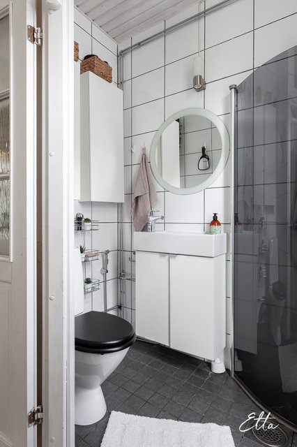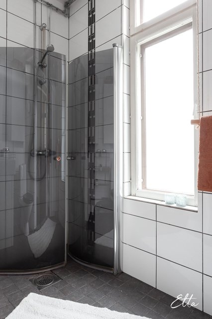 - WC-istuin, suihku, suihkuseinä, pesukoneliitäntä, lattialämmitys, pesuallas, allaskaappi, peili, ja bidee-suihku