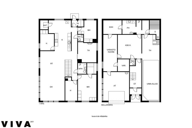 - Pinta-alan peruste: Yhtiöjärjestyksen mukainen, Isännöitsijäntodistuksen mukainen, (Pinta-ala ei ole tarkistusmitattu ja todellinen pinta-ala voi olla suurempi tai pienempi, kuin ilmoitettu). Pinta-alat saattavat tämän ikäisissä kohteissa (yhtiö rekisteröity ennen 01.01.1992) poiketa olennaisestikin asuinrakennusten nykyisten mittaustapojen ja standardien (SFS 5139) mukaan laskettavasta asuintilojen pinta-alasta. Muut tilat 50 m2, autotalli (151-200) Alakerran muut tilat: ei lasketa asuinpinta-alaan. Eteinen, takkahuone, uima-allas, 2 varastohuonetta, wc, askarteluhuone, sauna, pesuhuone ja khh / pukuhuone. Yhtiöjärjestyksessä huoneistoselitelmä 6h+k, 149 m2