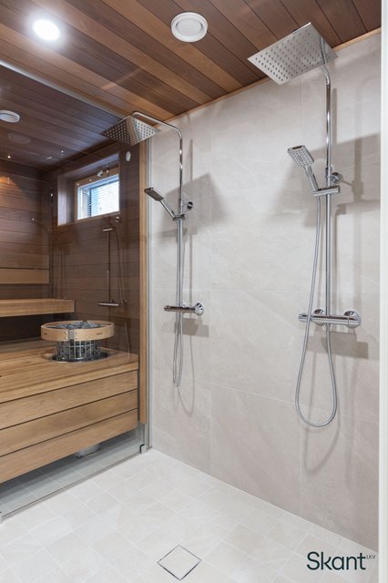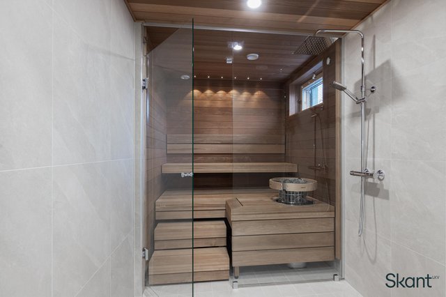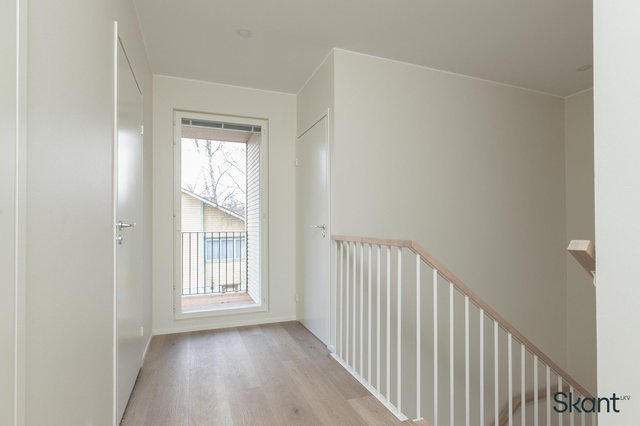 Yläkerrassa sijaitsevat kolme makuuhuonetta, asunnon toinen WC sekä kylpyhuone, kodinhoitohuone ja sauna, jotka on suunniteltu yhtenäiseksi, toimivaksi kokonaisuudeksi. Kodinhoitohuoneessa on mukavasti säilytystilaa ja laskutasoa, sekä käynti asunnon parvekkeelle.