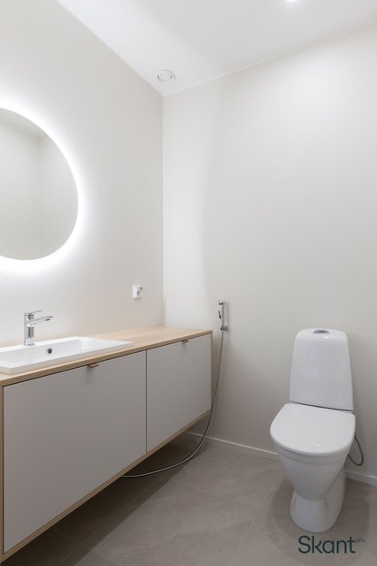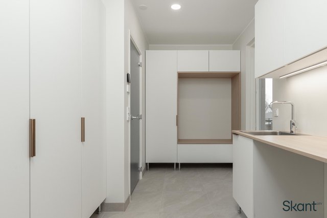 - Pesukoneliitäntä, tila pesutornille (Rinnakkain asennettuna), lattialämmitys, pesuallas, lattiakaivo, pyykkikaapit, ja pöytätaso