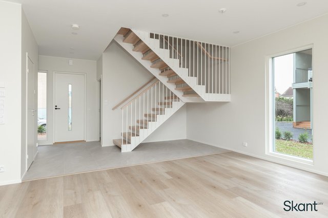 Tämä juuri valmistunut omakotitalo tarjoaa modernin ja vaivattoman asumisen kahdessa kerroksessa.