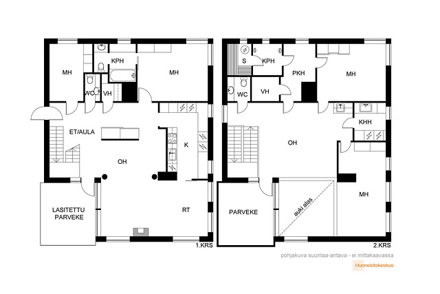 - Kaksi isoa olohuonetta ala- ja yläkerrassa. Avoimen tilan huonekorkeus n. 5,6 metriä. Alakerta Lattia: parketti Seinät: maalattu, hiertopinnoite sto Katto: maalattu Valokisko Yläkerta Lattia: parketti ja laatta Seinät: maalattu, tapetti Valokisko PIeni apukeittiö kaapistoilla, pöytätasolla ja vesipisteellä.
