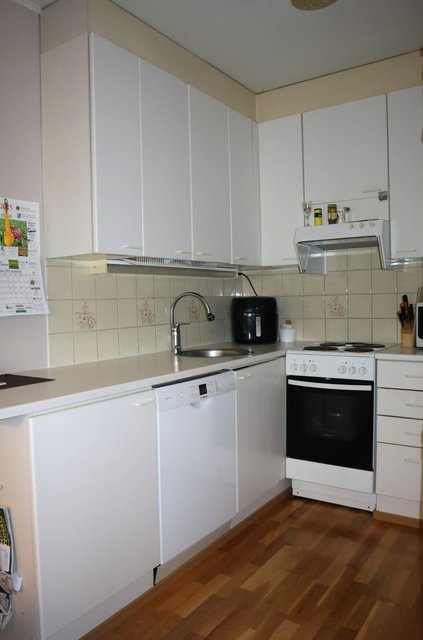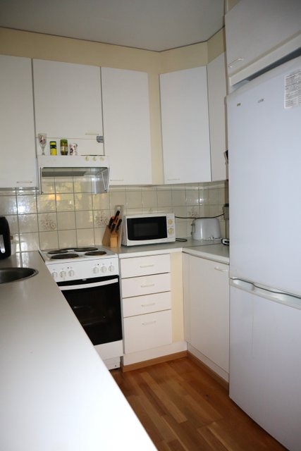 - Valkoiset kaapistot, liesi, jääkaappipakastin sekä astianpesukone