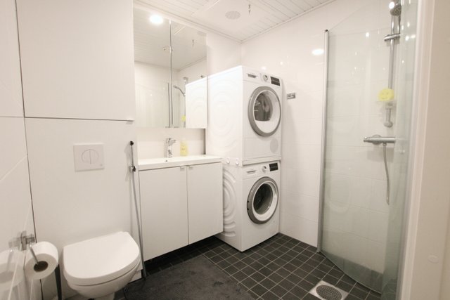 - WC-istuin, suihku, suihkuseinä, pesukoneliitäntä, lattialämmitys, peilikaappi, pesuallas, ja bidee-suihku