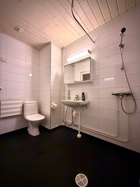 - WC-istuin, suihku, pesukoneliitäntä, peilikaappi, pesuallas, ja bidee-suihku