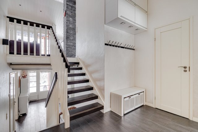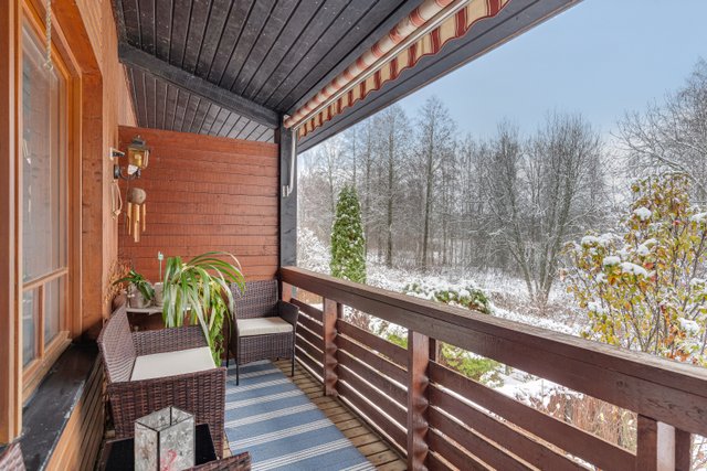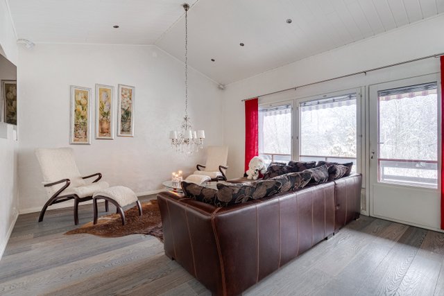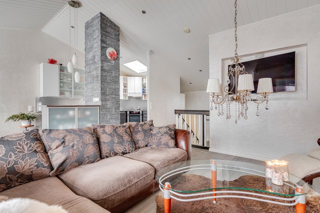 Asunto on kolmessa kerroksessa ja sen asuinpinta-ala on 99,5 m². Yläkerrassa on tilava olohuone, josta Saimaanäkymät. Varaava takka löytyy alakerran