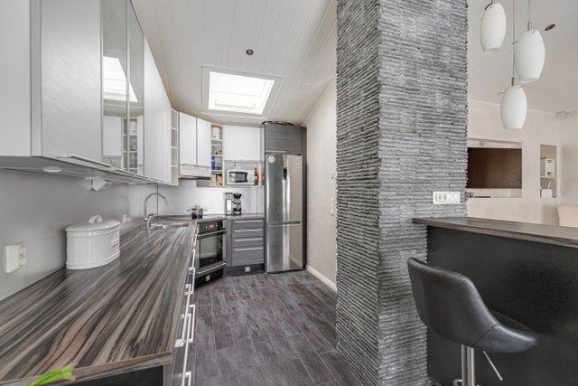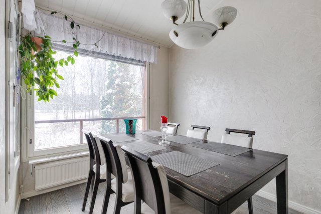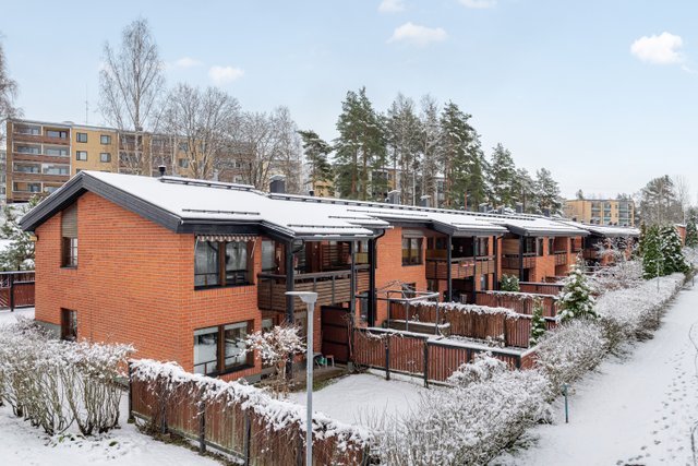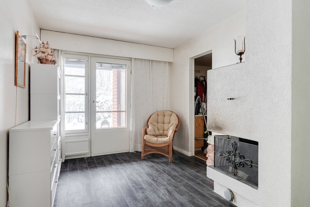 takkahuoneesta, joka luo kodikasta tunnelmaa. Näyttävä parkettilattia jatkuu keittiöön, jossa on modernit kodinkoneet ja kivitasot. Asunnossa on kolme makuuhuonetta, jotka tarjoavat runsaasti tilaa perheen tarpeisiin.