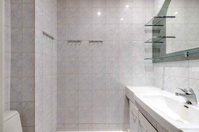Kylpyhuone on tyylikäs ja käytännöllinen, ja siellä on lattialämmitys. Lisäksi asunnossa on oma sauna, jossa voit rentoutua arjen kiireiden keskellä. Käytännöllisyyttä lisäävät erillinen kodinhoitohuone sekä vaatehuone ja ulkovarasto.