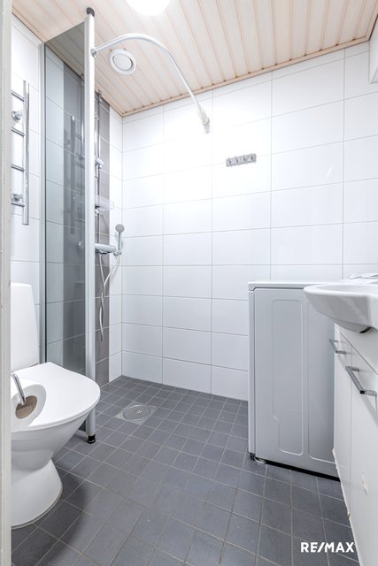 - WC-istuin, suihku, pesukone, pesukoneliitäntä, pesuallas, allaskaappi, lattialämmitys, ja peili