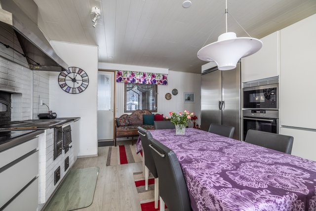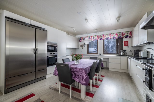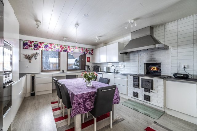 - Keittiö uusittu täysin 2016: kaapit (AlaCarte-keittiöt, sävy Matta Usva) ja työtasot, kaikki koneet rosteri eli korkeat jääkaappi ja pakastin (Festivo side by side), induktio liesitaso ja kaappiuuni, mikroaaltouuni, astianpesukone, pieni viinikaappi (2026). Puuliesi ja leivinuuni., Tilava, kodin sydän!